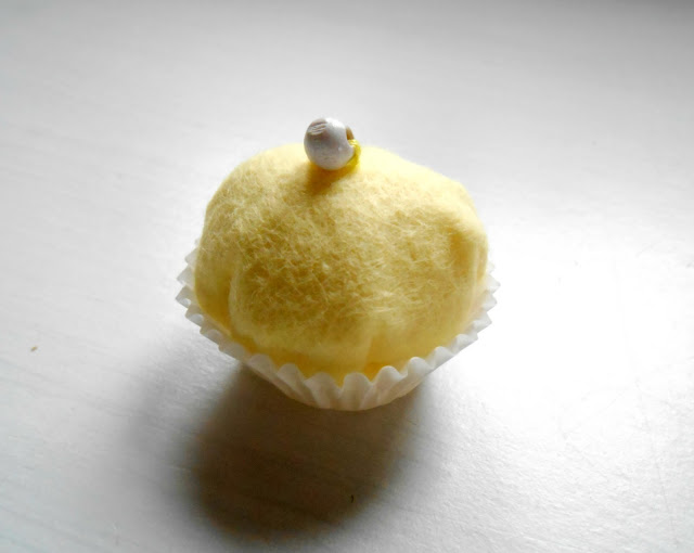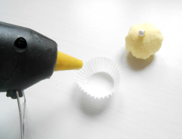 Pingue uma gotinha de cola quente no fundo da forminha e encaixe o docinho dentro segurando pela miçanga, como se fosse uma tampa de panela e fixe-o na forminha.