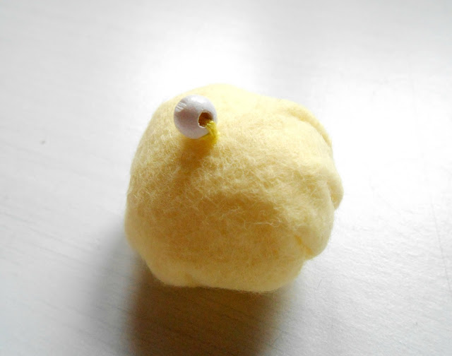 O primeiro passo é passar linha e agulha fazendo uma costurinha franzida como na foto em torno do círculo de feltro até formar uma bolinha entreaberta.