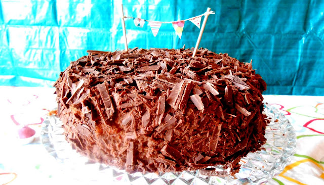A receita do bolo de baunilha foi descoberta pela amiga no blog Glorious Treats. É na verdade, uma receita para cupcakes adaptada para o bolo que foi coberto com raspas de chocolate. O topper do bolo foi feito com um simples varal de bandeirolas de washi tape segurado por palitinhos de churrasco. Mas fiz bandeirolas de verdade que também se fizeram presente na festinha.