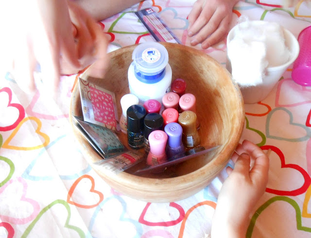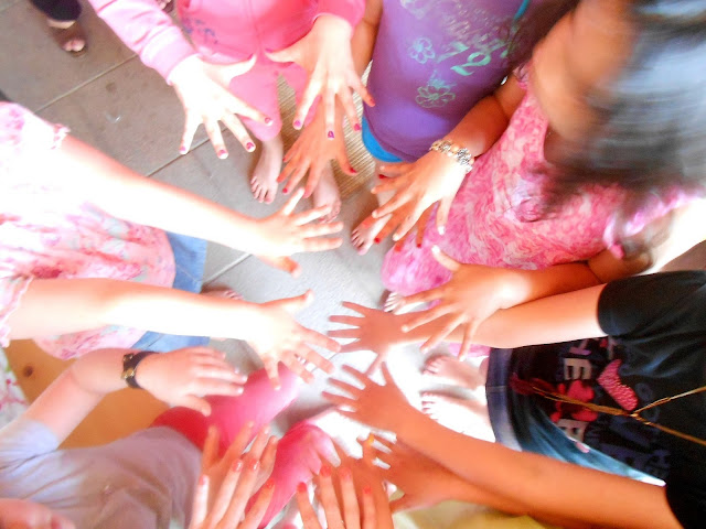 Para ocupar as meninas, comprei esmaltes coloridos e acessórios para unha e todas elas fizeram a unha juntas. Foi uma diversão só. Virei manicure neste dia.