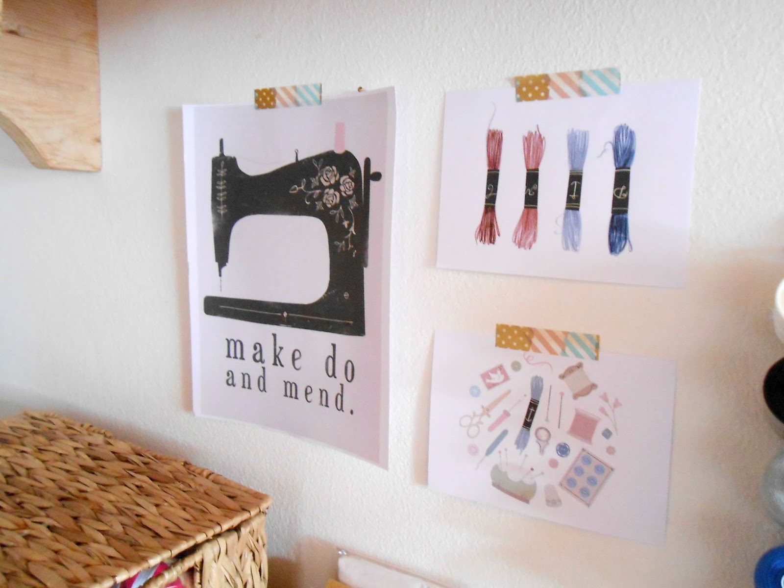 Ainda sem molduras, as ilustrações fofíssimas da Clare Owen, disponíveis em sua loja Etsy receberam uma ajudinha de fitas japonesas decorativas para me inspirarem e pensar como pendurá-las na parede.
