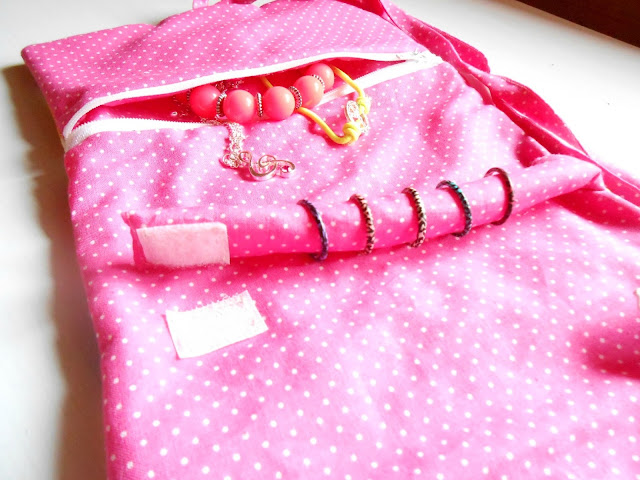 Lembrei imediatamente de uma sugestão do livro Sew! da Cath Kidston, que era um porta-jóias, daqueles modelos antigos que eu costumava ver em casa, quando as vizinhas visitavam minha mãe e tinham estojos semelhantes pra vender bijuterias e ganhar um dinheirinho extra. O porta-anel é o que mais me lembra deles. Espero que ela goste do estojinho e das bijus que comprei pra ela estrear.