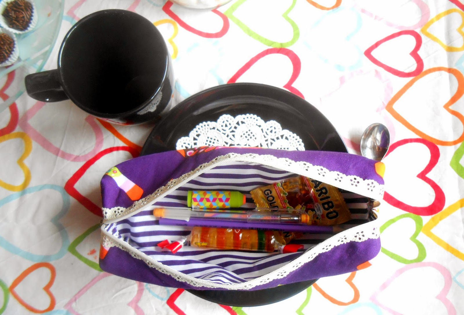 A menina vai pra quinta série em setembro e assim, vai mudar de escola e se separar das amigas que a acompanharam nos primeiros 4 anos escolares. Ela teve então a idéia de convidar 3 amigas para passarem a noite aqui como uma festa de despedida. Elas também resolveram se presentear com pequenas coisas entre si e isso, foi uma idéia da minha filha sem sequer me perguntar, mas ela já veio me sugerir que eu costurasse estojos para as meninas pra não gastar dinheiro. Coisa que faço o ano todo para festas de aniversários das amiguinhas. Lá fui eu correndo fazer 3 estojos pra ontem e só pensei em usar o meu zíper dos sonhos nesses estojos.