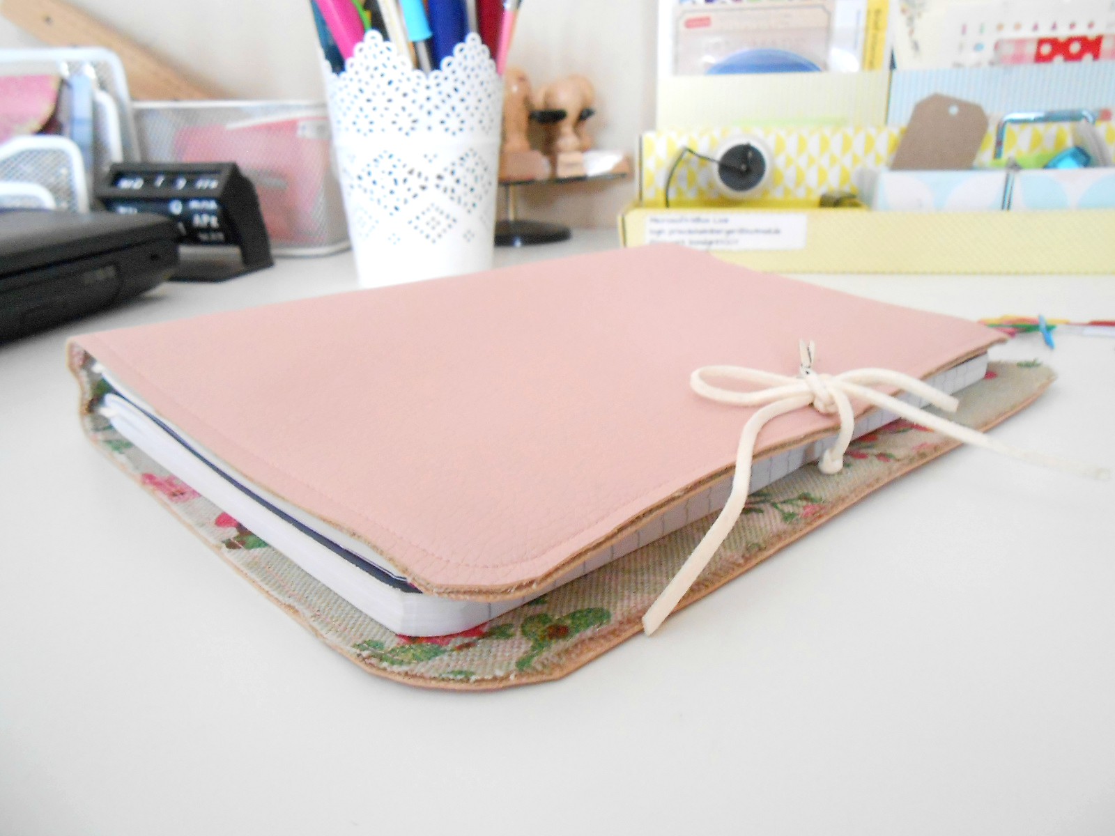 Chega de mostrar meus segredinhos. Fecho meu traveler's notebook com um laço e um pingente de tesourinha junto ao nó. Aqui começo a organizar minha rotina no papel e na caneta. Como antigamente...