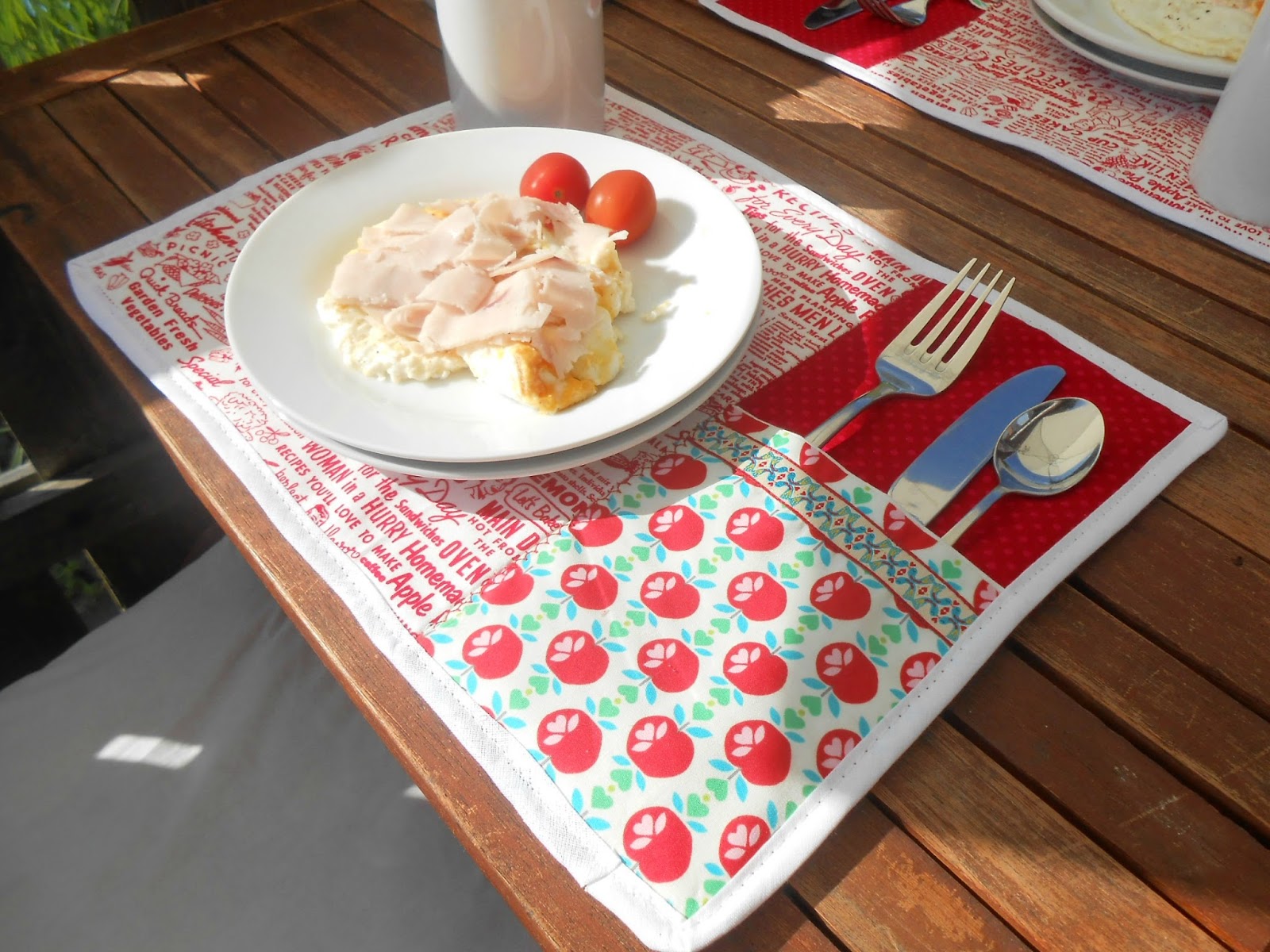 Fiz um par de jogos americanos pra servir um café da manhã pra uma amiga. Nos encontramos às vezes pra fazer a primeira refeição do dia juntas em cafés, mas de um tempo pra cá tem sido interessante fazer nas nossas casas. E pra chegar perto, mesmo que longe, desses aconchegantes estabelecimentos, eu usei o restinho dessa charmosa estampa pra alegrar nossa manhã.
