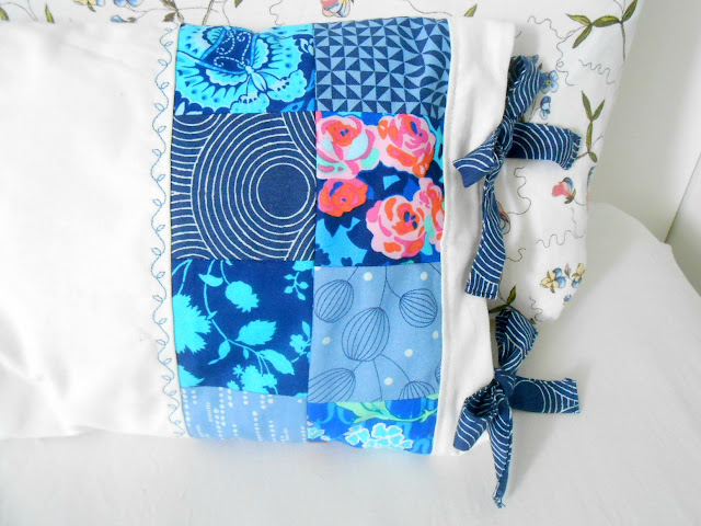 Inspirada no azul das paredes do meu quarto, escolhi estampas diversas nessa cor. Saí do padrão zíper, botão e velcro para fechar as capas de almofadas, optando pelos laços ou por uma sobreposição maior dos tecidos no verso.