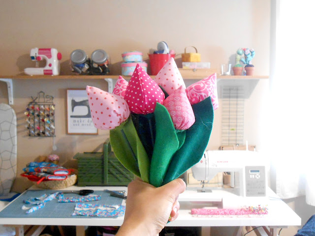 Não é de hoje que faço flores pro meu cantinho criativo. A contagem regressiva pra chegada da primavera já começou no meu pensamento. O frio do rigoroso inverno alemão me prende dentro de casa e reconheço que meu cantinho da costura é até um refúgio do frio lá de fora, vindo a ser muito produtivo nessa época do ano. Porém, a primavera me inspira mais, me liberta ( inclusive de um casaco pesado aí...) pra fora de casa, pra ver o verde, as flores brotando, o sol iluminando a vida e esquentando a alma. Então, me permiti fazer esse projeto para aguardar essa estação tão linda.